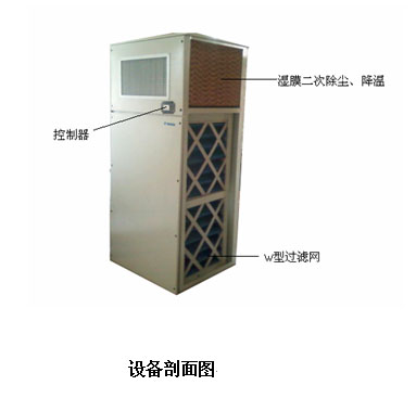 智能新风湿帘降温机是北京嘉诚禾信机电节能设备有限公司专为中大型通信机房设计的一款节能型智能通风空调器(设备机组),在室外环境温度低于室内温度的情况下,通过第一次几何体过滤装置静压除尘(公司技术)引入室外新风,湿帘对其引进的新风进行第二次除尘和降温。根据温度确定是否排出室内热风。湿帘降温机能最大效率的提高新风系统的使用率(引进的新风温度经过湿帘后能降低3-5度,室外温度高于设置温度3-5度时也能正常使用)。该产品采三个技术手段进行除尘与降温,产品技术领先同行,减少了空调的运行时间,从而达到节能降耗的目的。并解决了通信运行商担心在核心机房安装使用造成灰尘影响设备的顾虑。